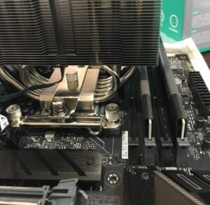 確かにマザーボードの中でCPUクーラーはギリギリに見えます。でも何とかつきました。メモリを4枚の構成にしたら干渉したかもしれません。今回は16GB×2だったので、うまくよけれたようです。